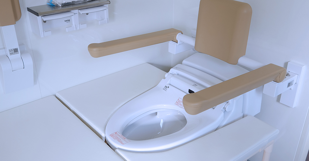 右側には水洗トイレと、それに続く移乗台。一番手前が水洗トイレで、奥に向かって移乗台とデッキがつながっています