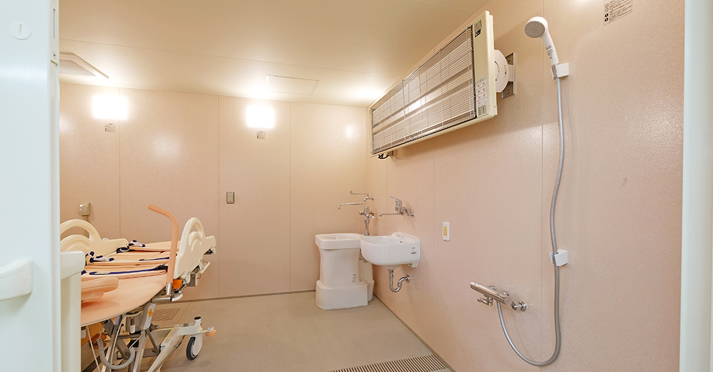 介護入浴機器(シャワー浴タイプ)と大型浴槽の設置に対応 6.1m×7mの広々としたユニット内にシャワー浴タイプの介護入浴機器「セレーノ」と2000×1600サイズの大型浴槽を設置。 「セレーノ」はストレッチャーに寝たまま ... 続きを読む