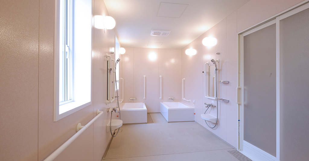 2台の個浴槽と将来的な機械浴増設に対応した設計約5.2m×7.6mの大型ユニットに、1200サイズの個浴槽を2台設置。それぞれ3方向からの介助が可能な設計としました。 機械浴側にはシャワーカーテンを設置し、プライバシーを ... 続きを読む