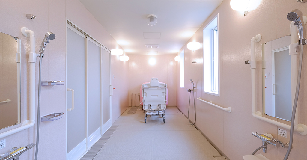 介護入浴機器(シャワー浴タイプ)と大型浴槽の設置に対応 6.1m×7mの広々としたユニット内にシャワー浴タイプの介護入浴機器「セレーノ」と2000×1600サイズの大型浴槽を設置。 「セレーノ」はストレッチャーに寝たまま ... 続きを読む