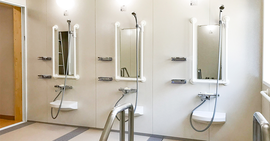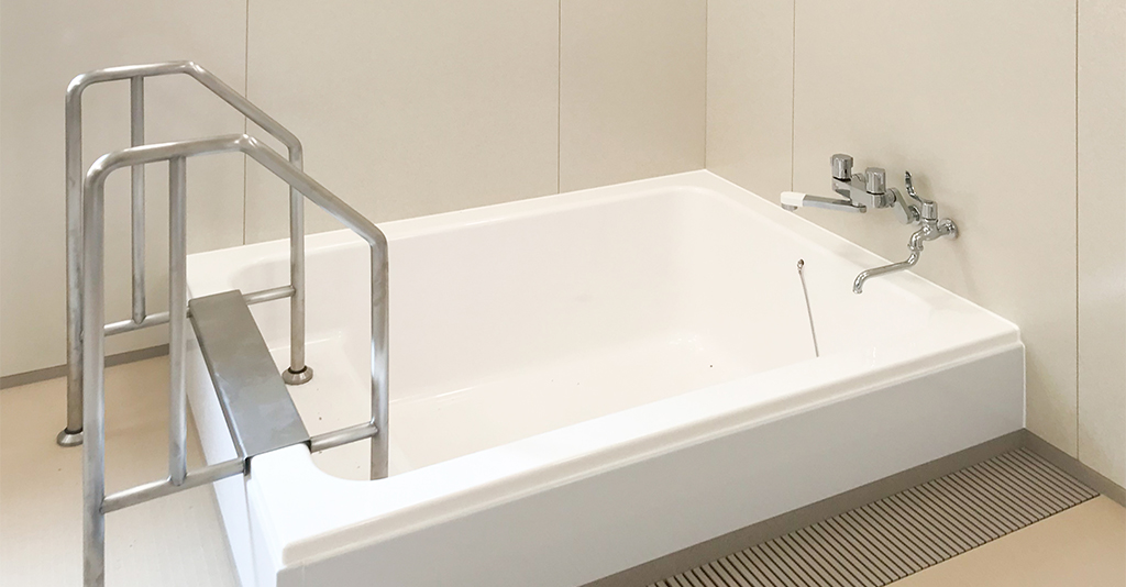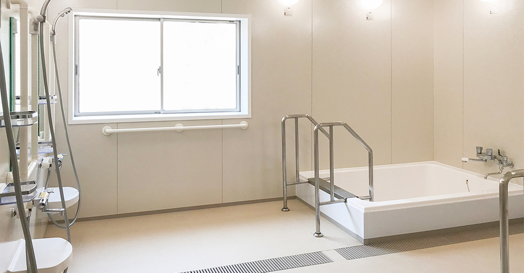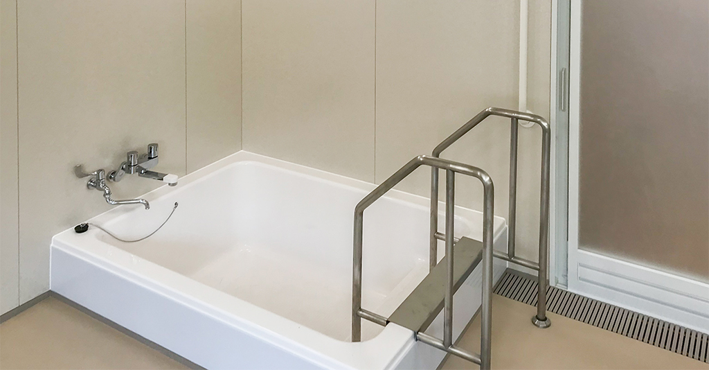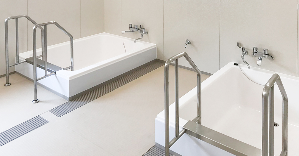 1600×1200サイズのFRP製大型浴槽を2台設置 障がい者支援施設の浴室の老朽化により、改修した事例です。メンテナンス性と工期短縮の為、ユニットを採用。