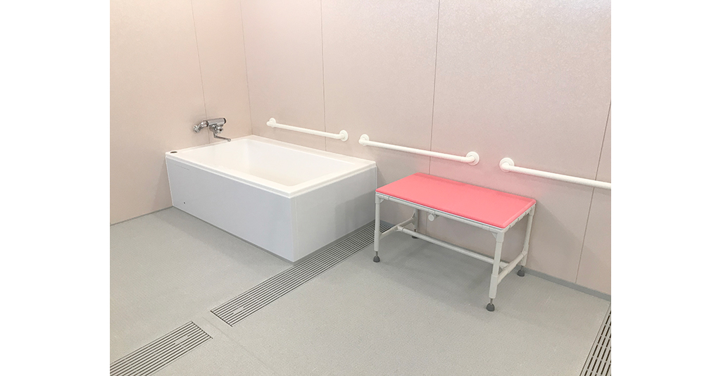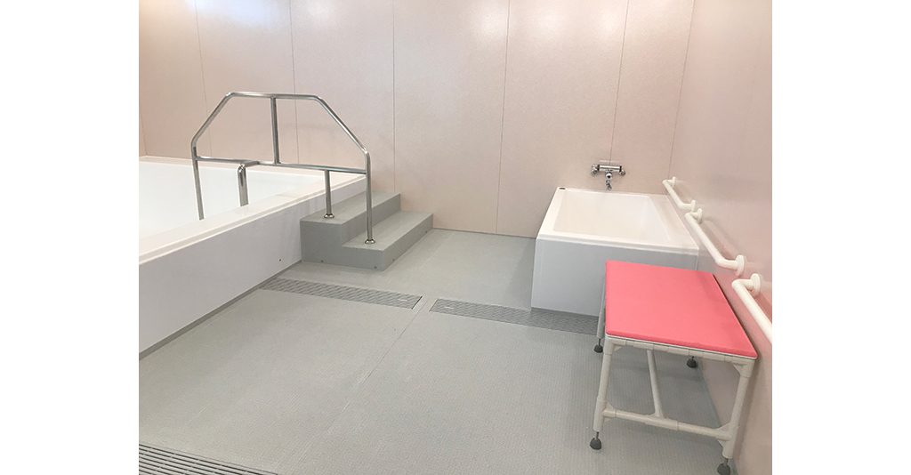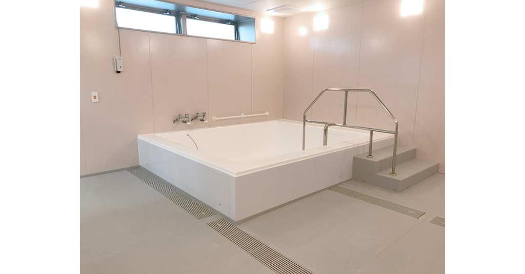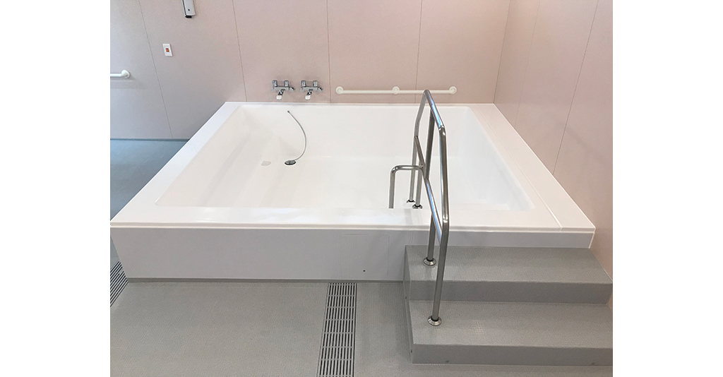 2295×2700サイズの特注大型浴槽と1400サイズの個浴浴槽を設置 大型浴槽には、浴槽内側と外側にステップをつけ、浴槽高さに合わせたSUS製特注手すりを設置しています。その為、またぎ高さを気にすることなく、手すりに掴まりながらスムーズな入浴が可能。介護が必要な方は、個浴浴槽で介助者がサポートできます。