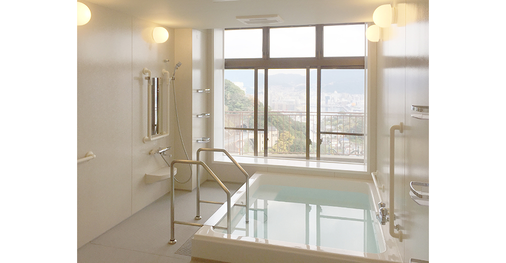 自立入浴を支援し将来的な機械浴導入にも対応約5.5m×5.5mの特注大型浴槽を備えた共同浴場タイプのユニットです。 浴槽は柱欠きに対応した形状で、内部にステップを設けることで出入りをしやすくし、底面にはノンスリップ加工を ... 続きを読む
