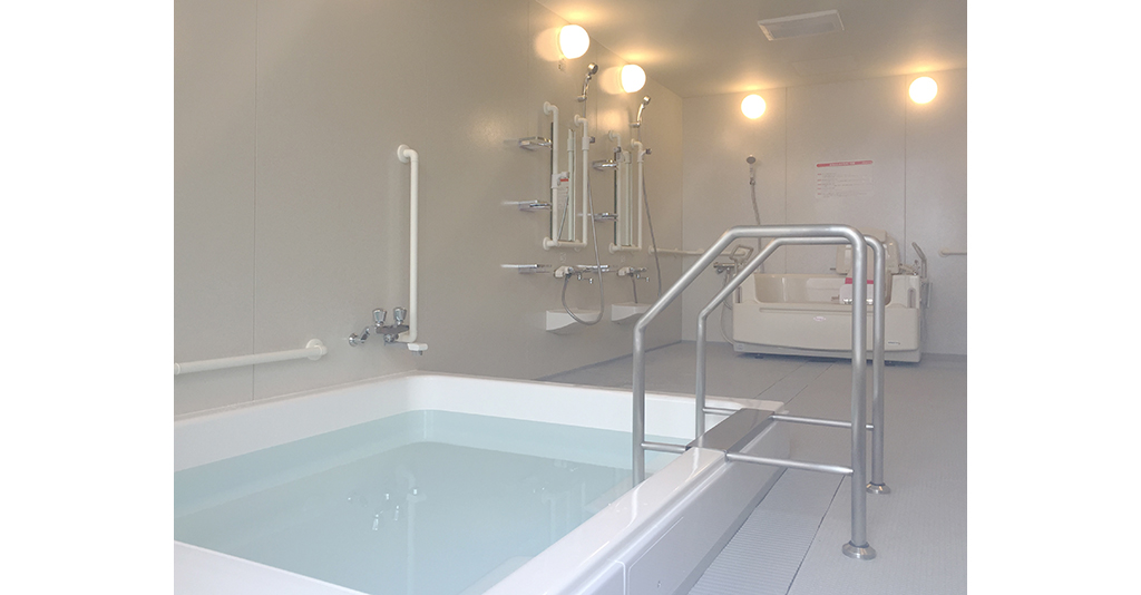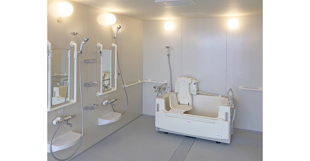 介護入浴機器(シャワー浴タイプ)と大型浴槽の設置に対応 6.1m×7mの広々としたユニット内にシャワー浴タイプの介護入浴機器「セレーノ」と2000×1600サイズの大型浴槽を設置。 「セレーノ」はストレッチャーに寝たまま ... 続きを読む