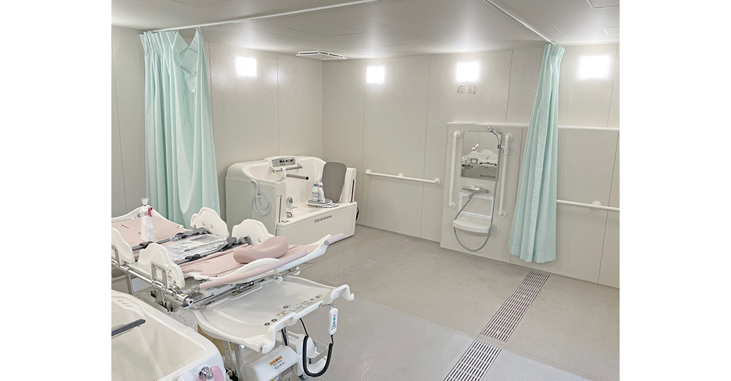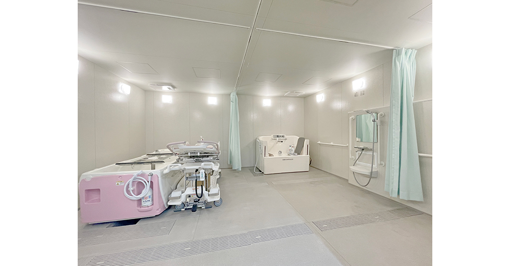 シャワーカーテンで仕切ることでプライバシーに配慮4670mm×4150mmサイズの大型ユニット内に寝浴タイプのジュストと、個浴リフトタイプのボランテを設置。