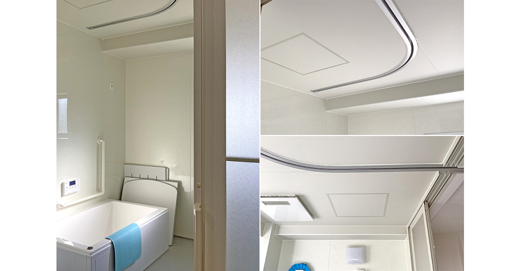 シャワーカーテンで仕切ることでプライバシーに配慮4670mm×4150mmサイズの大型ユニット内に寝浴タイプのジュストと、個浴リフトタイプのボランテを設置。 天井にカーテンレールを十字に配置しているので、それぞれの機械浴 ... 続きを読む