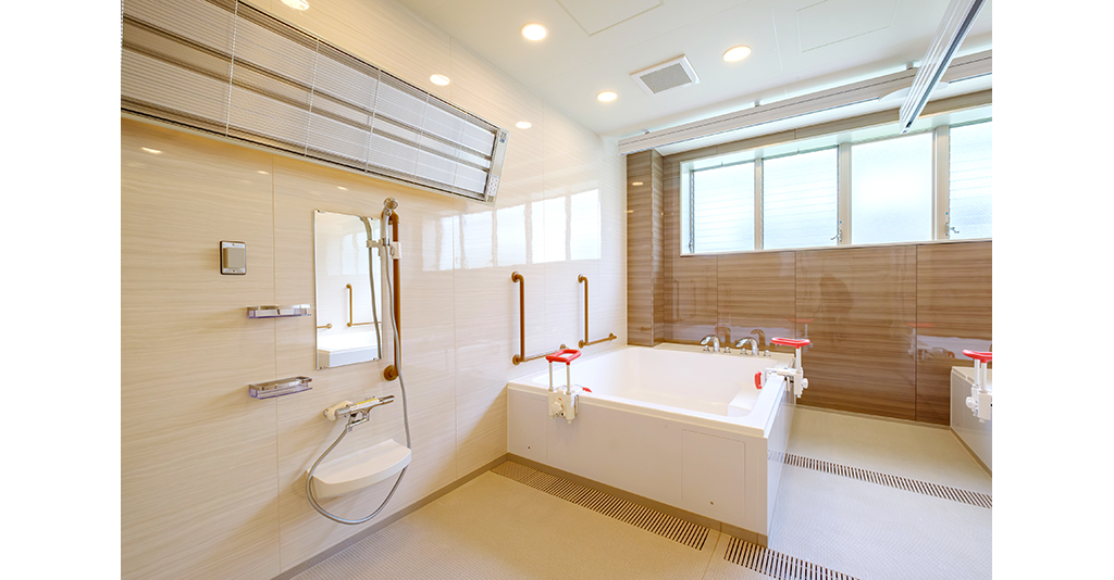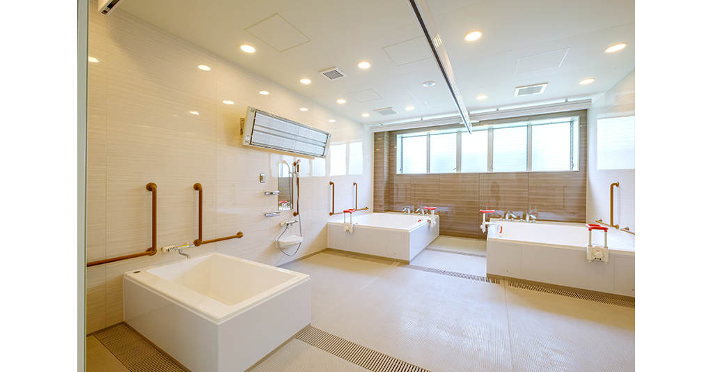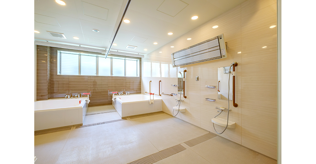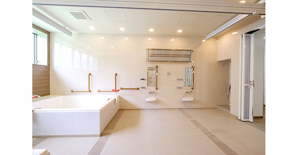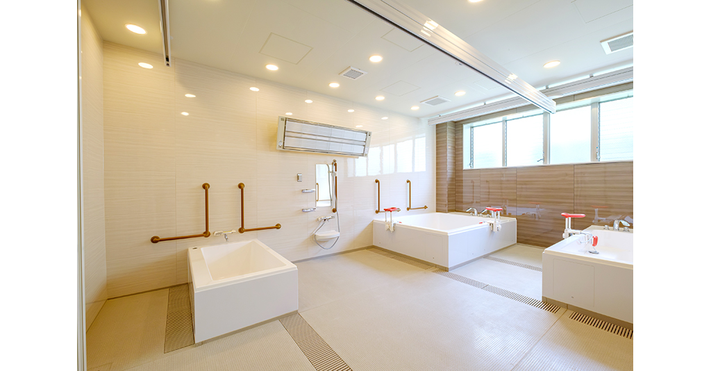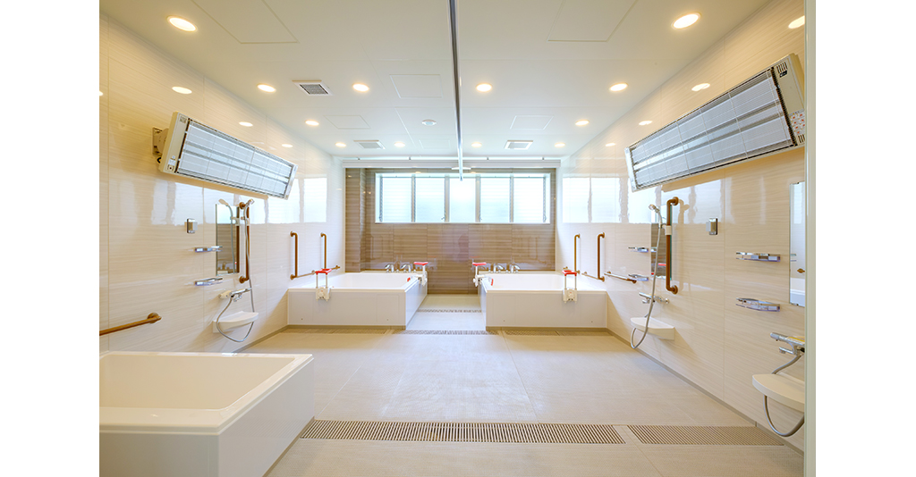 自立入浴を支援し将来的な機械浴導入にも対応約5.5m×5.5mの特注大型浴槽を備えた共同浴場タイプのユニットです。 浴槽は柱欠きに対応した形状で、内部にステップを設けることで出入りをしやすくし、底面にはノンスリップ加工を ... 続きを読む