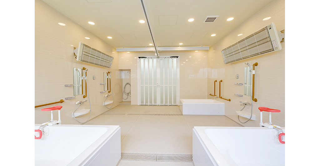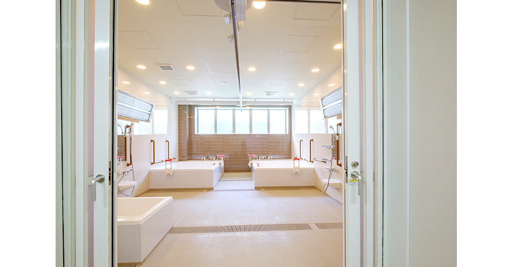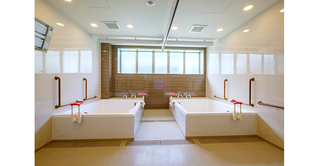 2台の個浴槽と将来的な機械浴増設に対応した設計約5.2m×7.6mの大型ユニットに、1200サイズの個浴槽を2台設置。それぞれ3方向からの介助が可能な設計としました。 機械浴側にはシャワーカーテンを設置し、プライバシーを ... 続きを読む
