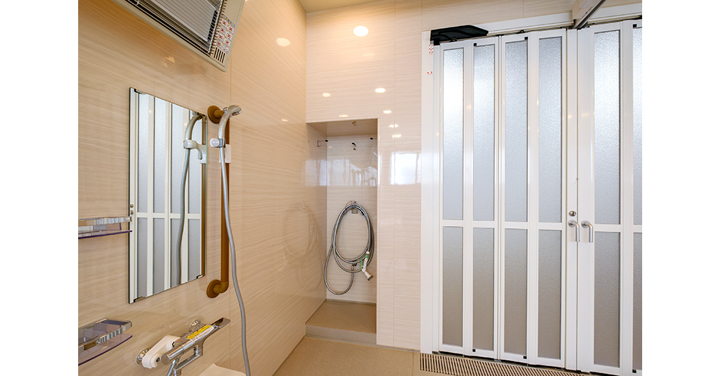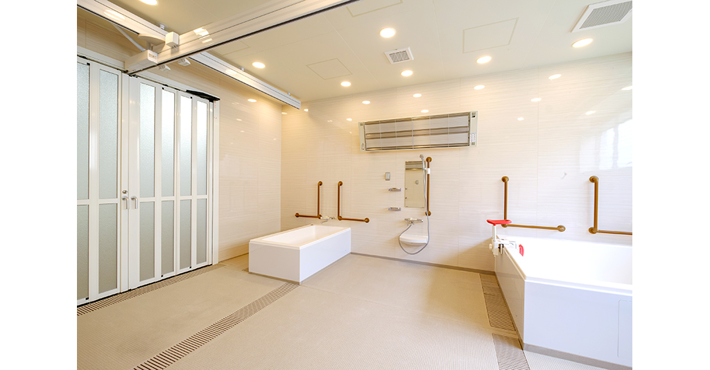 介護入浴機器(シャワー浴タイプ)と大型浴槽の設置に対応 6.1m×7mの広々としたユニット内にシャワー浴タイプの介護入浴機器「セレーノ」と2000×1600サイズの大型浴槽を設置。 「セレーノ」はストレッチャーに寝たまま ... 続きを読む
