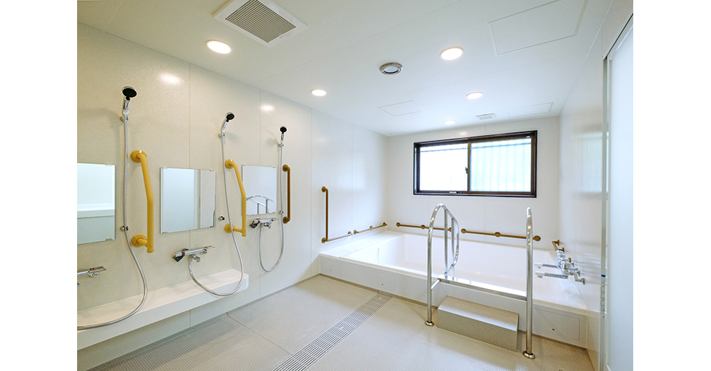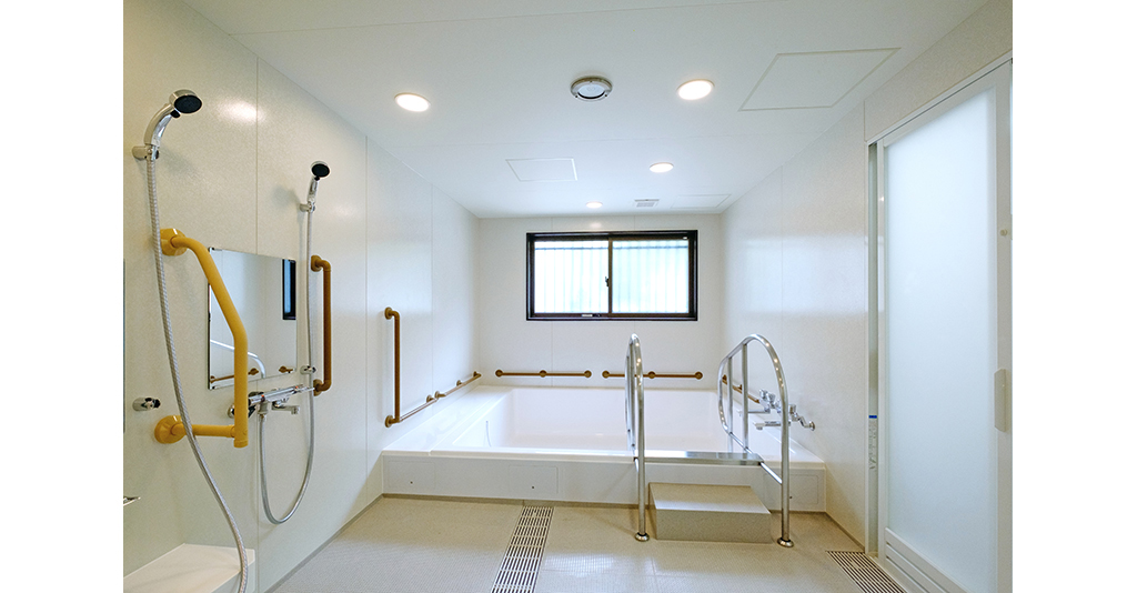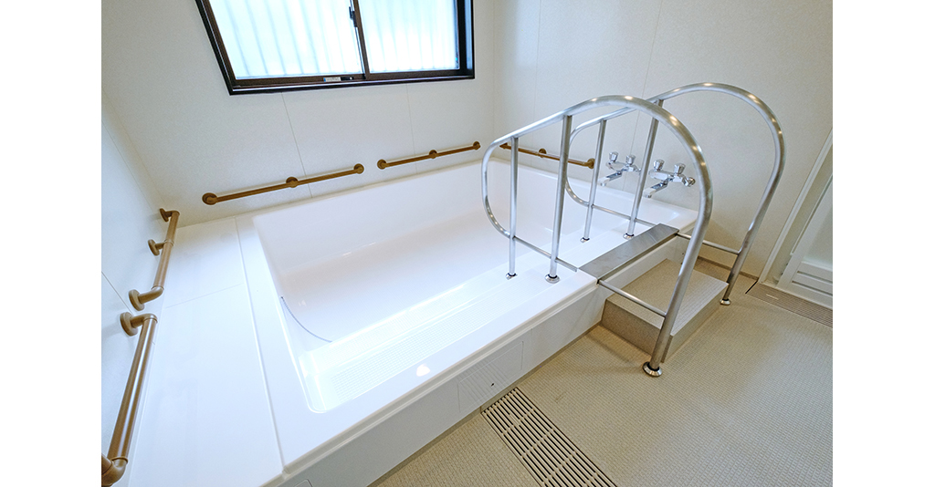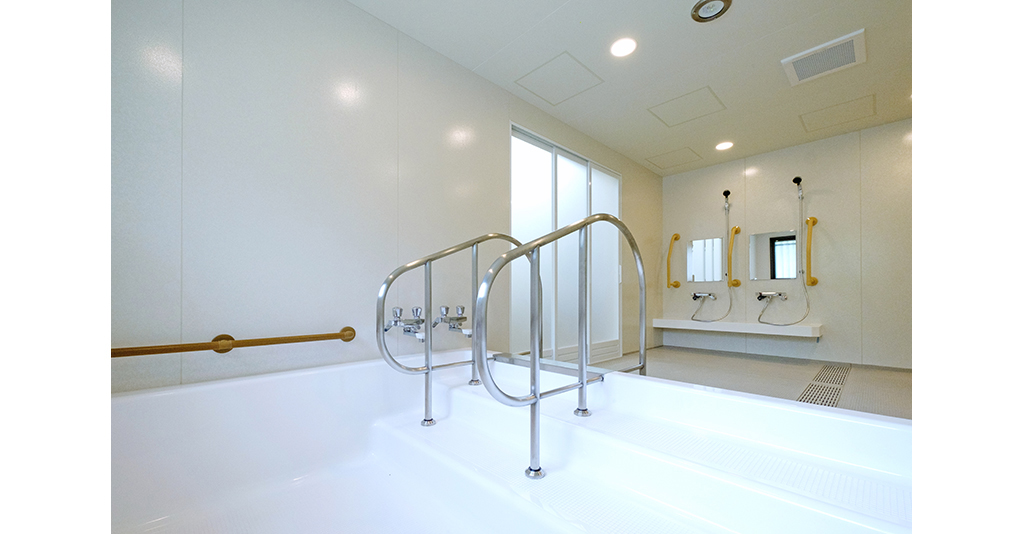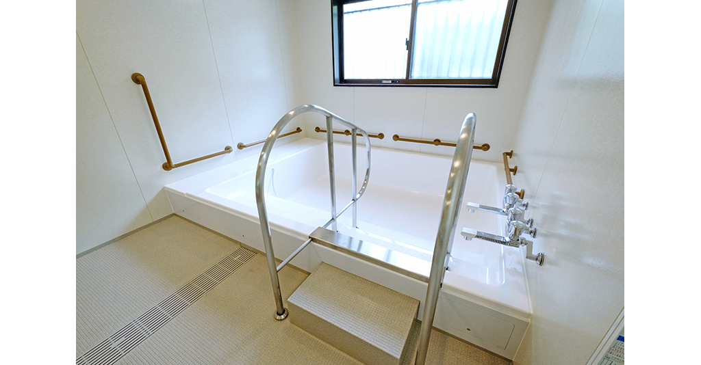 特注手すりと前後ステップ付きの特注大型浴槽を設置した共同浴事例約2.6×5m超えの広々ユニットに、壁幅に合わせた1990mm×2340mmサイズのステップ付きの特注浴槽を設置。