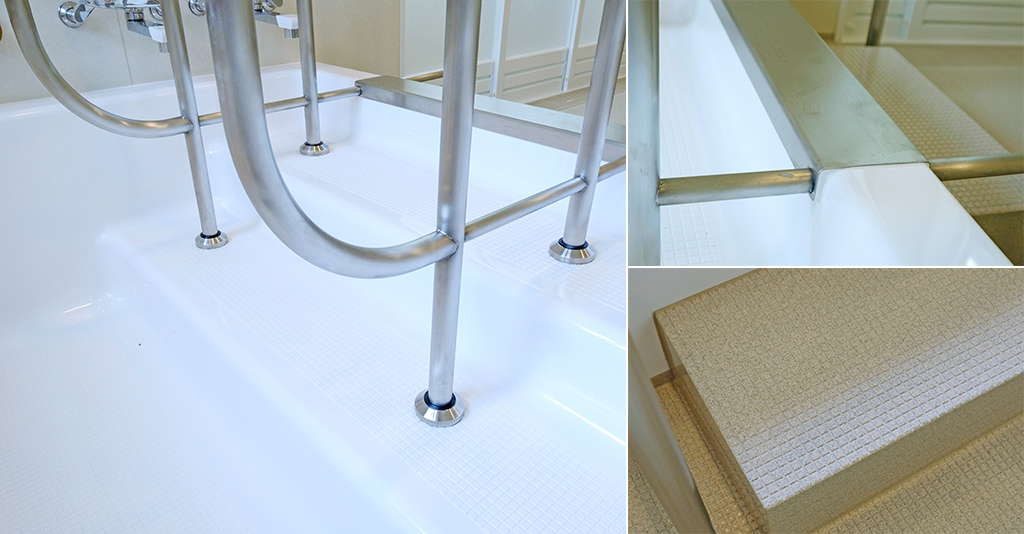 浴槽に取り付けられた手すりはステンレス製の特注形状。施設利用者の方が使いやすいように滑らかな形に加工しています。