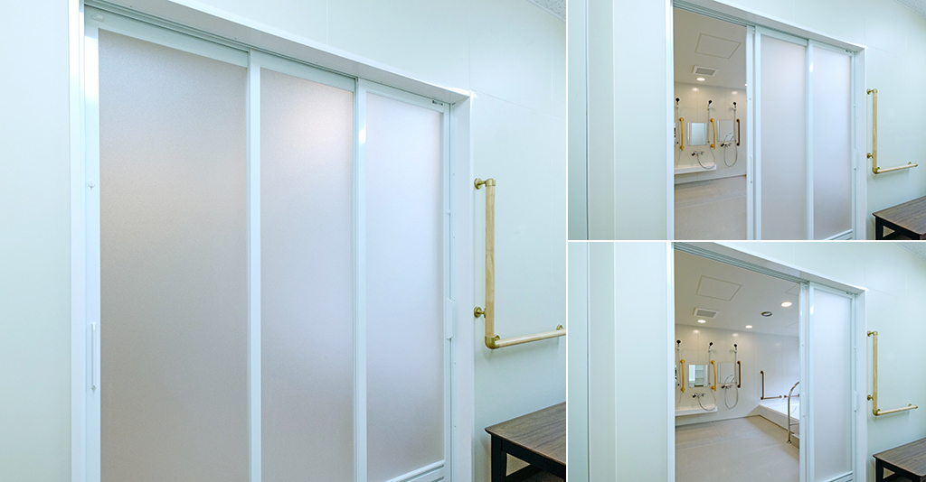 ドアは3枚引き戸両開きタイプ。左右どちらからでも出入り出来るので使い勝手が良く、バリアフリーなので、車いすでの出入りもスムーズです。