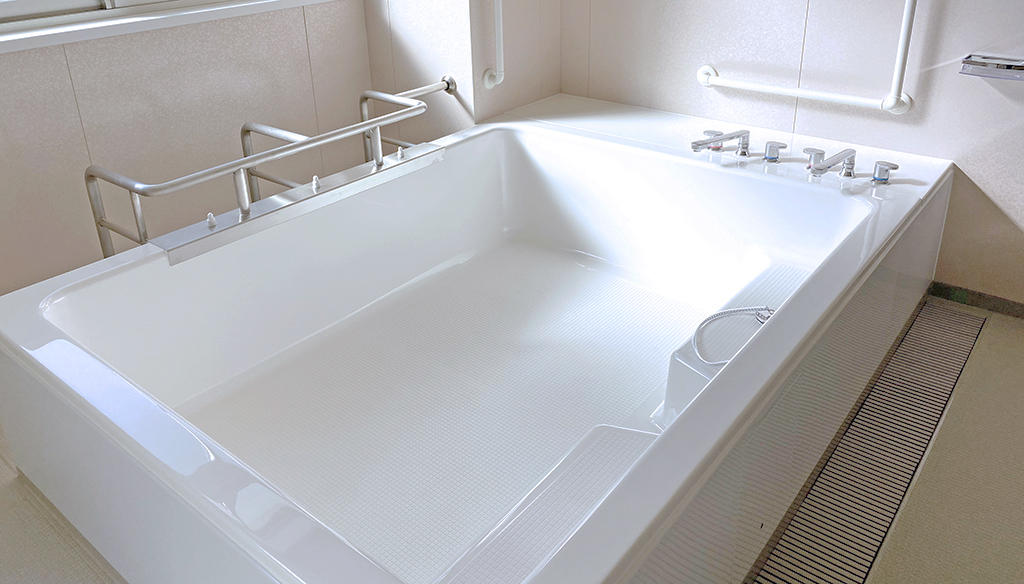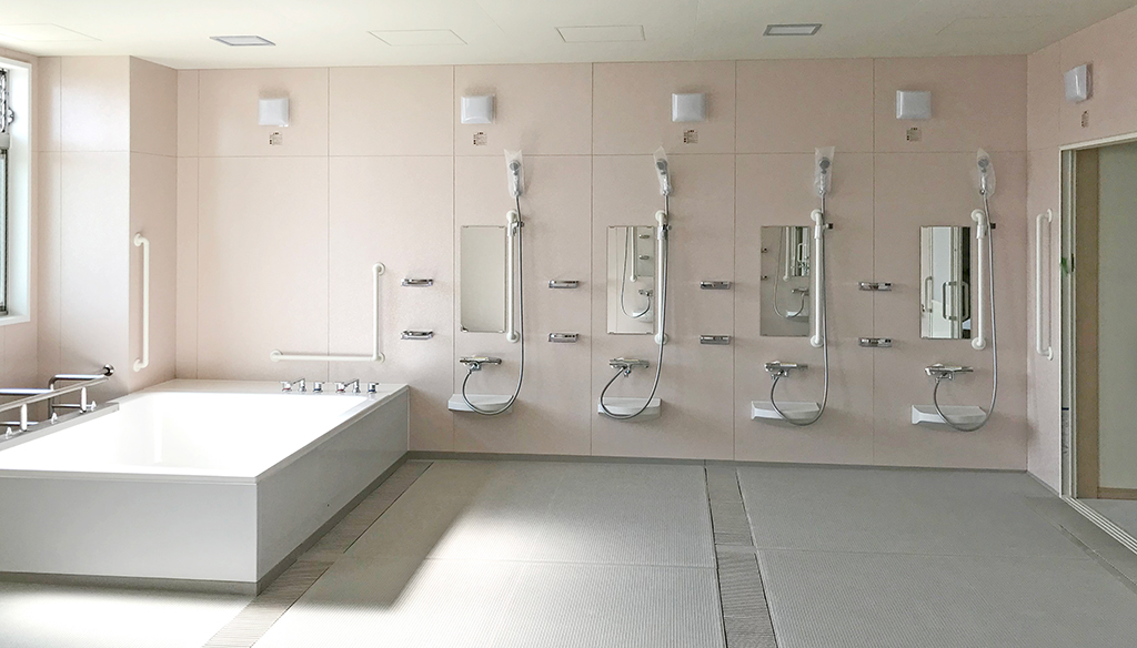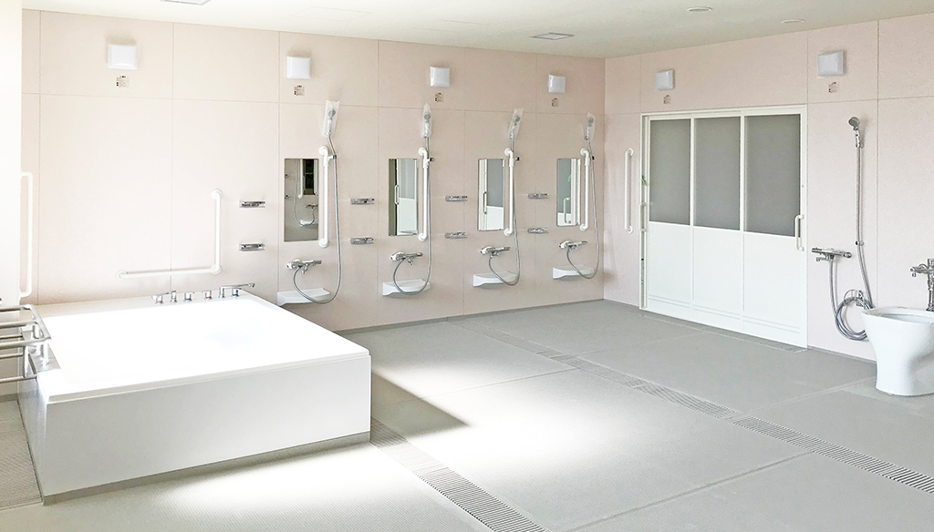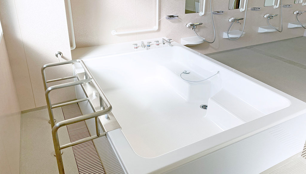 自立入浴を支援し将来的な機械浴導入にも対応約5.5m×5.5mの特注大型浴槽を備えた共同浴場タイプのユニットです。 浴槽は柱欠きに対応した形状で、内部にステップを設けることで出入りをしやすくし、底面にはノンスリップ加工を ... 続きを読む