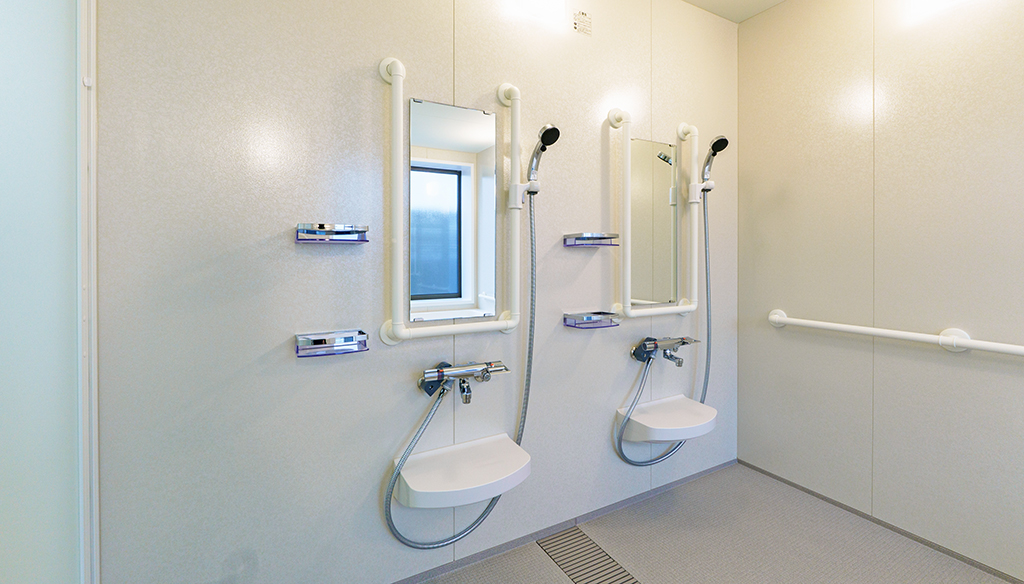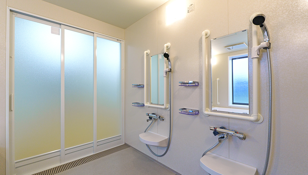 2台の個浴槽と将来的な機械浴増設に対応した設計約5.2m×7.6mの大型ユニットに、1200サイズの個浴槽を2台設置。それぞれ3方向からの介助が可能な設計としました。 機械浴側にはシャワーカーテンを設置し、プライバシーを ... 続きを読む