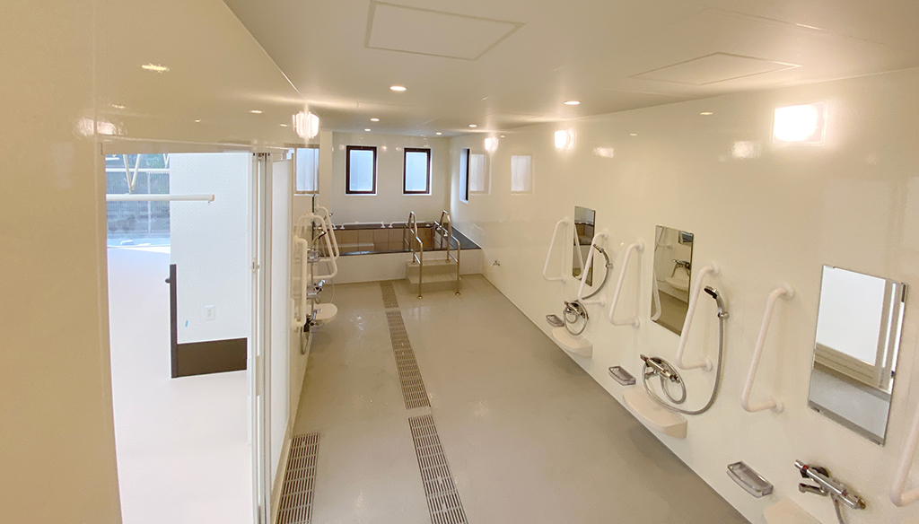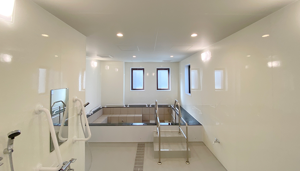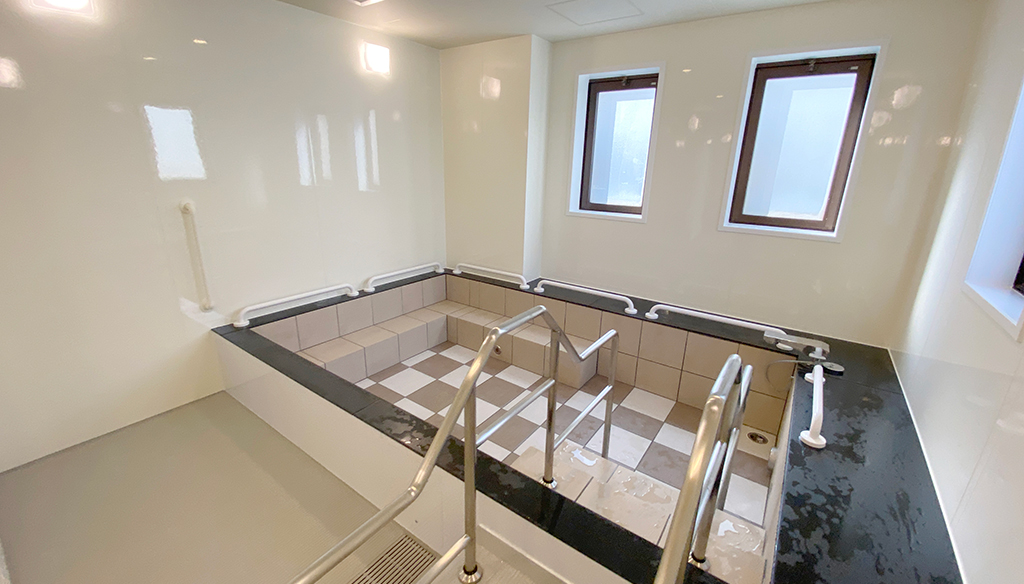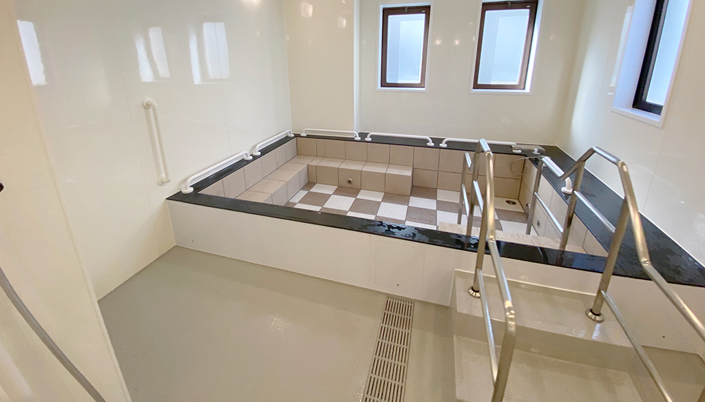 自立入浴を支援し将来的な機械浴導入にも対応約5.5m×5.5mの特注大型浴槽を備えた共同浴場タイプのユニットです。 浴槽は柱欠きに対応した形状で、内部にステップを設けることで出入りをしやすくし、底面にはノンスリップ加工を ... 続きを読む