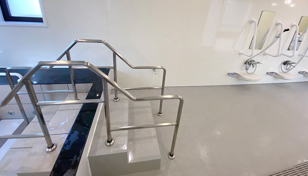 特注手すりと前後ステップ付きの特注大型浴槽を設置した共同浴事例約2.6×5m超えの広々ユニットに、壁幅に合わせた1990mm×2340mmサイズのステップ付きの特注浴槽を設置。 浴槽に取り付けられた手すりはステンレス製の ... 続きを読む