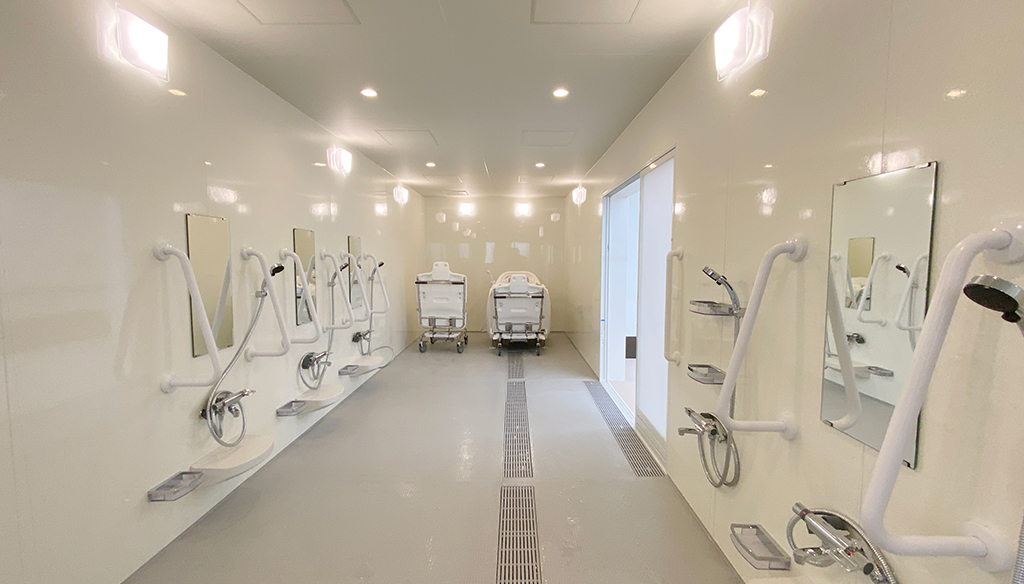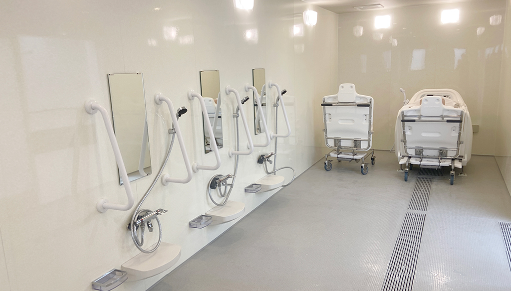 広々とした空間で複数のストレッチャー利用も可能広さ4520mm × 5700mmのゆとりある大型シャワールーム。 ストレッチャー浴専用として設計されたユニットですが、通常のシャワーとしても利用可能です。 出入口は3枚引き ... 続きを読む