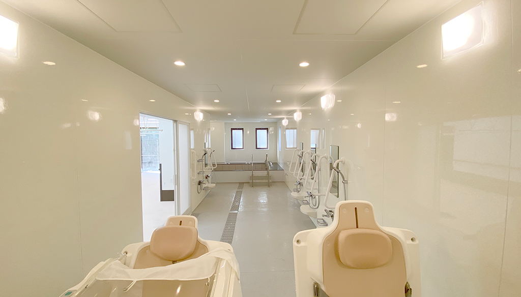 介護入浴機器(シャワー浴タイプ)と大型浴槽の設置に対応 6.1m×7mの広々としたユニット内にシャワー浴タイプの介護入浴機器「セレーノ」と2000×1600サイズの大型浴槽を設置。 「セレーノ」はストレッチャーに寝たまま ... 続きを読む