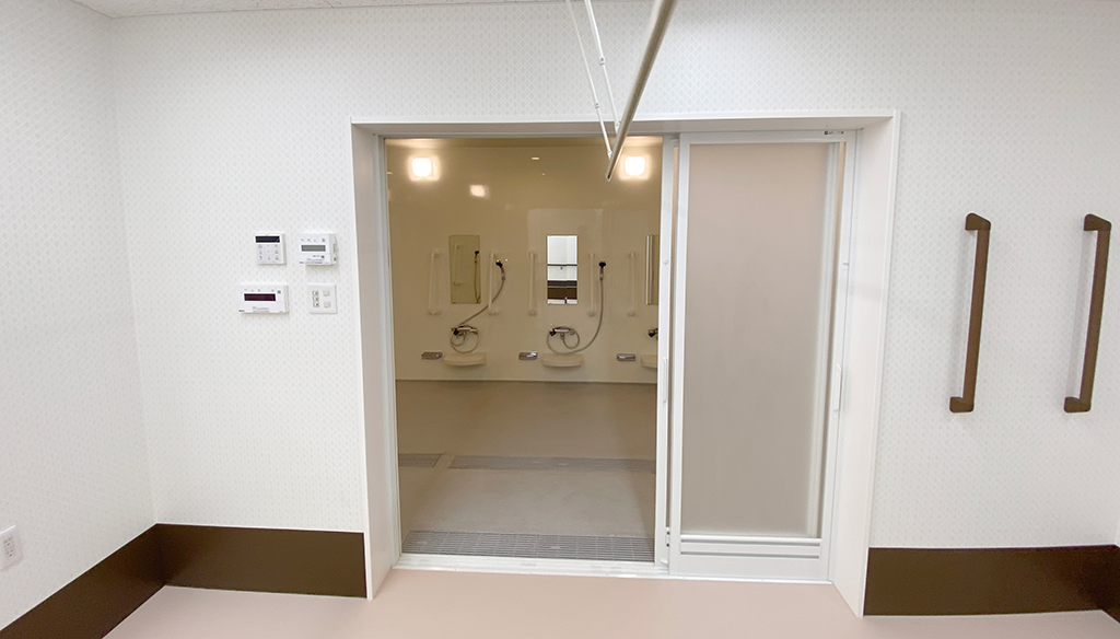2台の個浴槽と将来的な機械浴増設に対応した設計約5.2m×7.6mの大型ユニットに、1200サイズの個浴槽を2台設置。それぞれ3方向からの介助が可能な設計としました。 機械浴側にはシャワーカーテンを設置し、プライバシーを ... 続きを読む