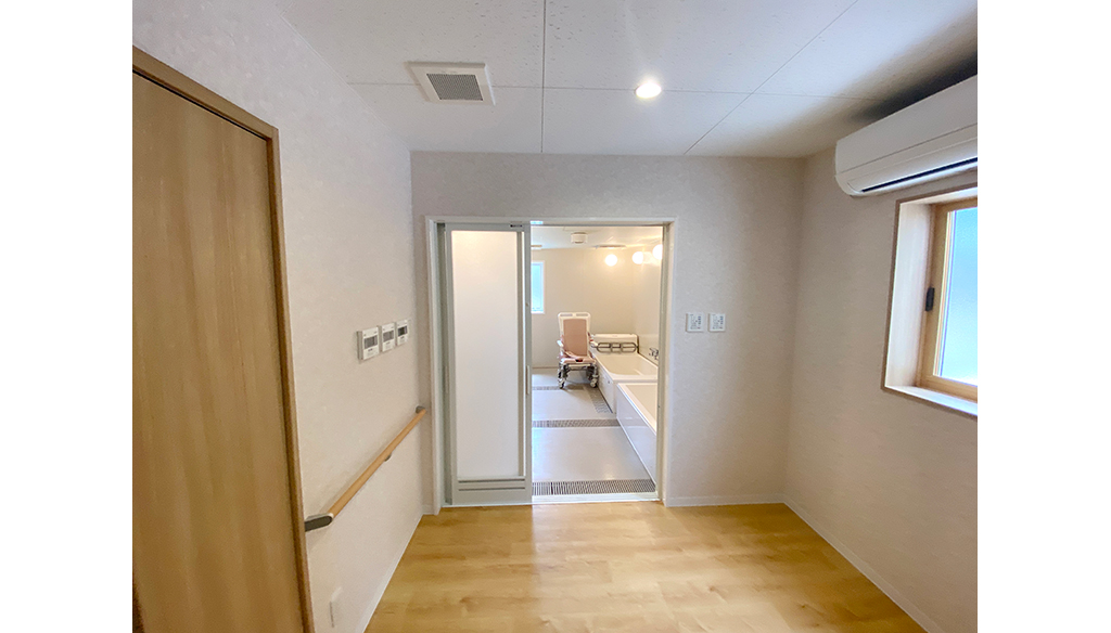 浴槽の配置は、機械浴メーカーと綿密に打ち合わせを行い、必要最小限のスペースで実現しました。