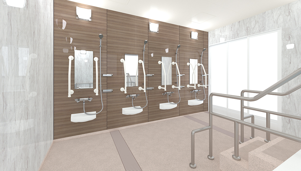- 洗い場4箇所(サーモシャワー水栓x4、ミラー300*700x4、洗面器台x4、化粧棚x8、パブリック用手すりx8)