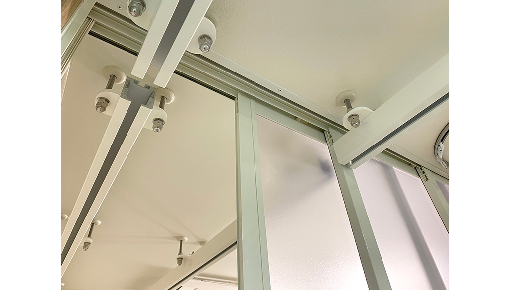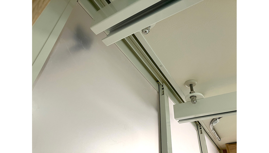 リフトの安定性を保つため2本のレールを設置。脱衣室と浴室をつなぐ三枚引き戸の切替え部分には、ドアの開閉時に干渉せず、リフト本体が安定した状態で可動できるよう、レールの隙間をミリ単位で調整しています。