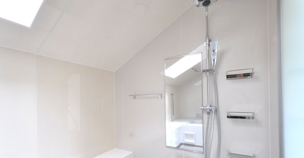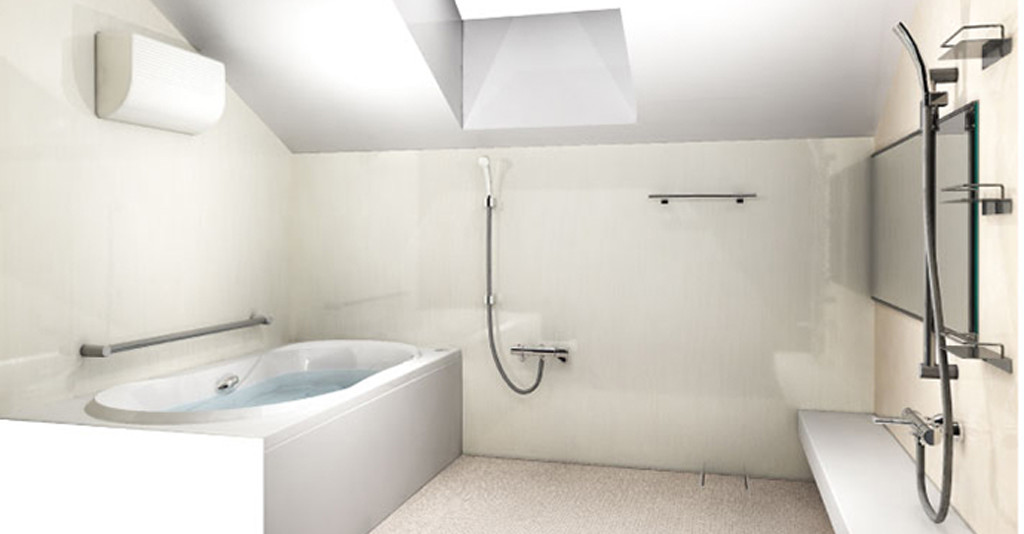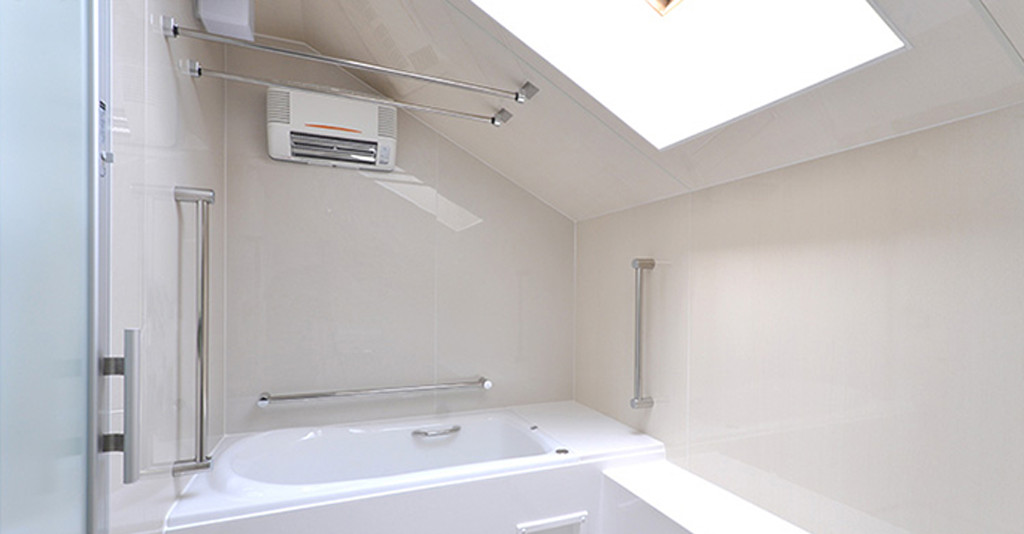 施主様からのご要望は”明るくキレイな浴室”! 在来の天窓をそのまま生かし、明るい色調のパネルを使ってスッキリとしたスタイルのご提案を、CGを使い提案しました。