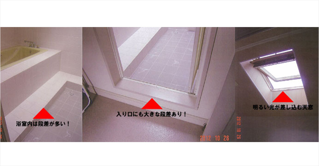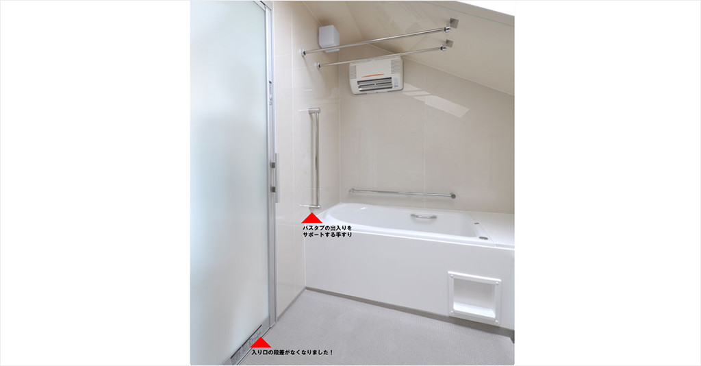 施主様は60代のご夫婦。できるだけ段差をなくして危ない部分をなくしたいとのことでした。入口にあった大きな段差をなくしフラットに。さらに浴槽周りに手すりを配置して、出入りをサポートできるようにしています。