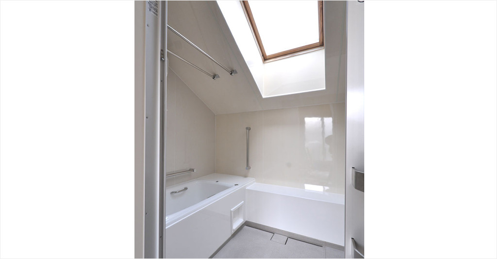福岡市内の戸建てをリフォームしました。リフォーム前は、タイル張りの年月がったっている在来浴室で、浴室内は段差が多く、つまずく恐れのある浴室でした。しかし天窓があったことから斬新な提案をすることができました。