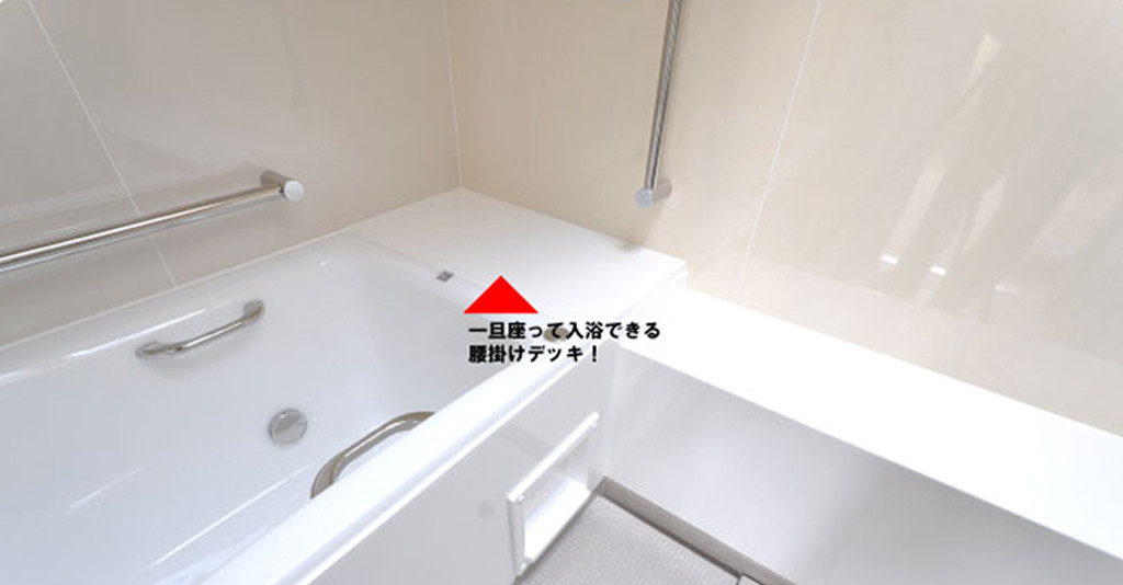 最初は浴槽に入る最大1700サイズの浴槽でご提案していましたが、あまり広すぎるのは好みではないと、1300サイズをセレクト。その分の空いたスペースは、いったん座って入浴できる腰掛デッキを設置しました。