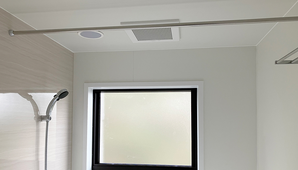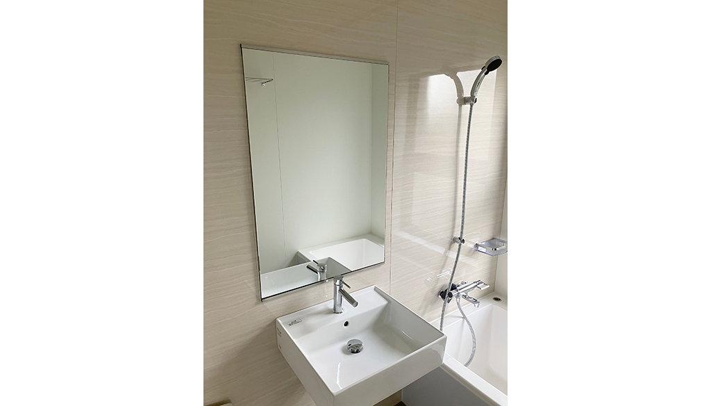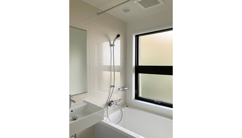浴室内のスペースに配慮してフラッシュドアは外開き仕様とし、くもり止めヒーター付きミラーや、シャワーカーテン用のランドリーパイプも設置。省スペースでも快適に使える工夫が詰まった事例です。